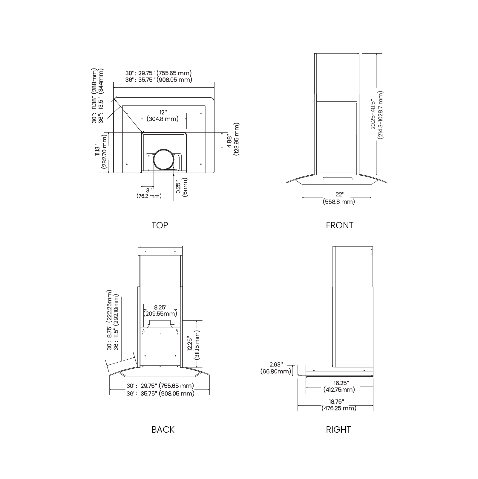 Hood Dimensions (W×D×H) | 29.75" × 18.75" × (22.25" - 42.5") |