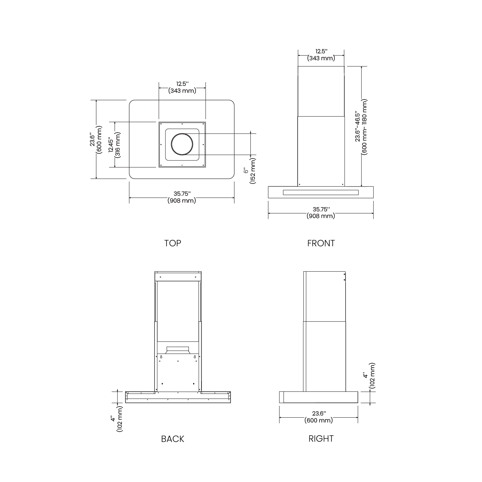 Hood Dimensions (W×D×H) | 35.75" × 23.6" × (27.6"- 50.5") |