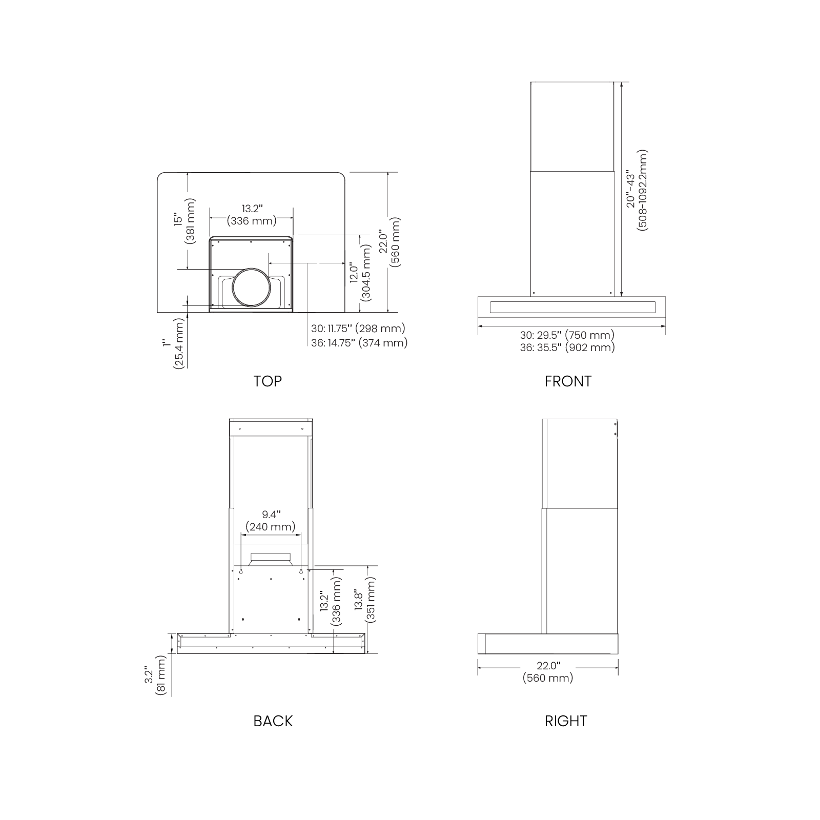 Hood Dimensions (W×D×H) | 29.5" × 22" × (23.2" - 46.2") |