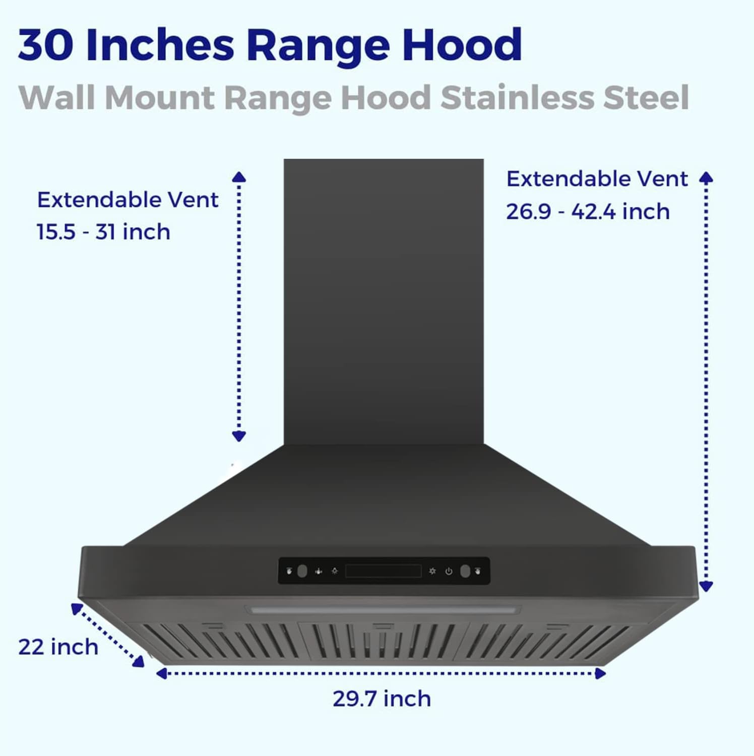- Strong Suction, High Efficiency: Engineered with an advanced turbo motor design, this premium black stainless steel range hood delivers exceptional 800 CFM suction power. Its durable, anti-corrosive construction ensures long-lasting performance while efficiently removing smoke and odors.