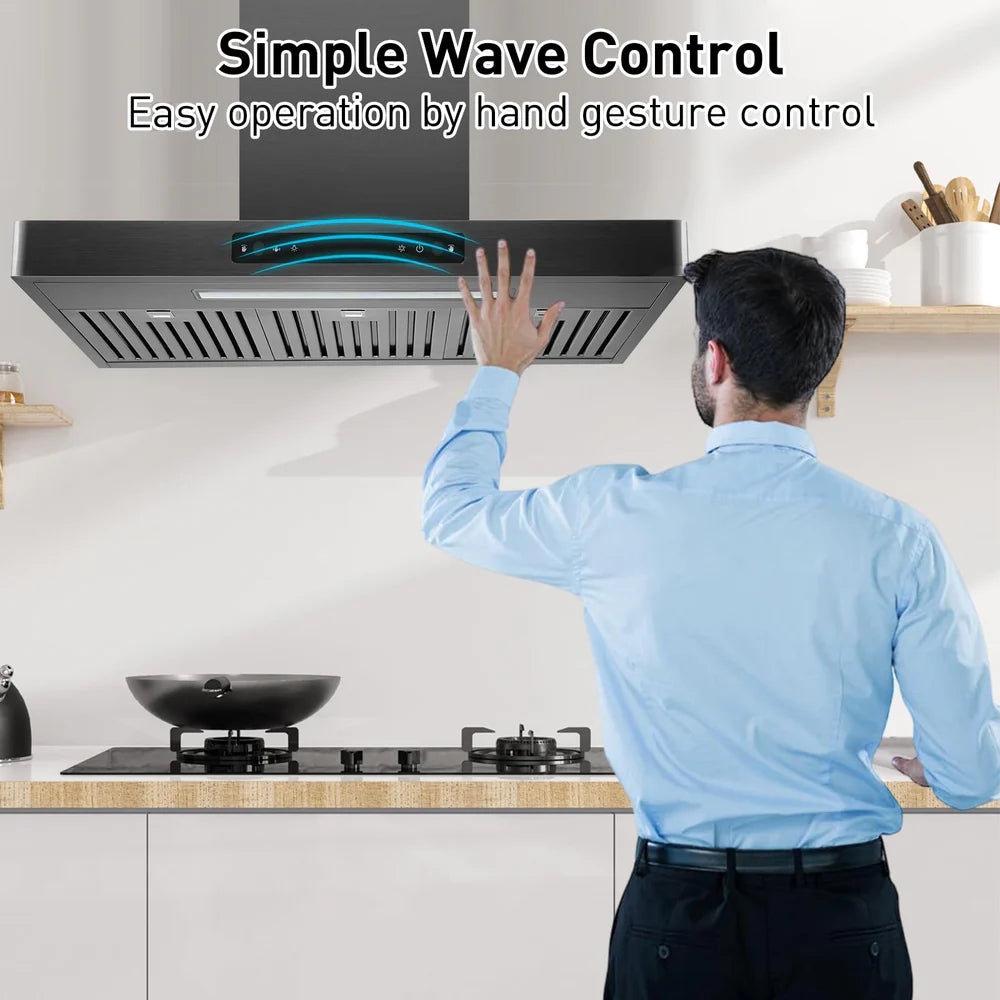 Vesta's Copenhagen 36" metallic-black stainless steel wall-mounted range hood is a durable companion for your kitchen. Featuring an ultra strong motor, a touchscreen panel, two baffle filters, and an LED light, this unit will elevate your cooking experience to new heights.