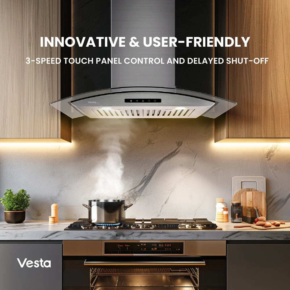 Vesta's Rome 30-inch stainless steel wall-mounted range hood is a durable companion for your kitchen. Featuring an ultra strong motor, a touchscreen panel, two baffle filters, and two LED lights, this unit will elevate your cooking experience to new heights.
