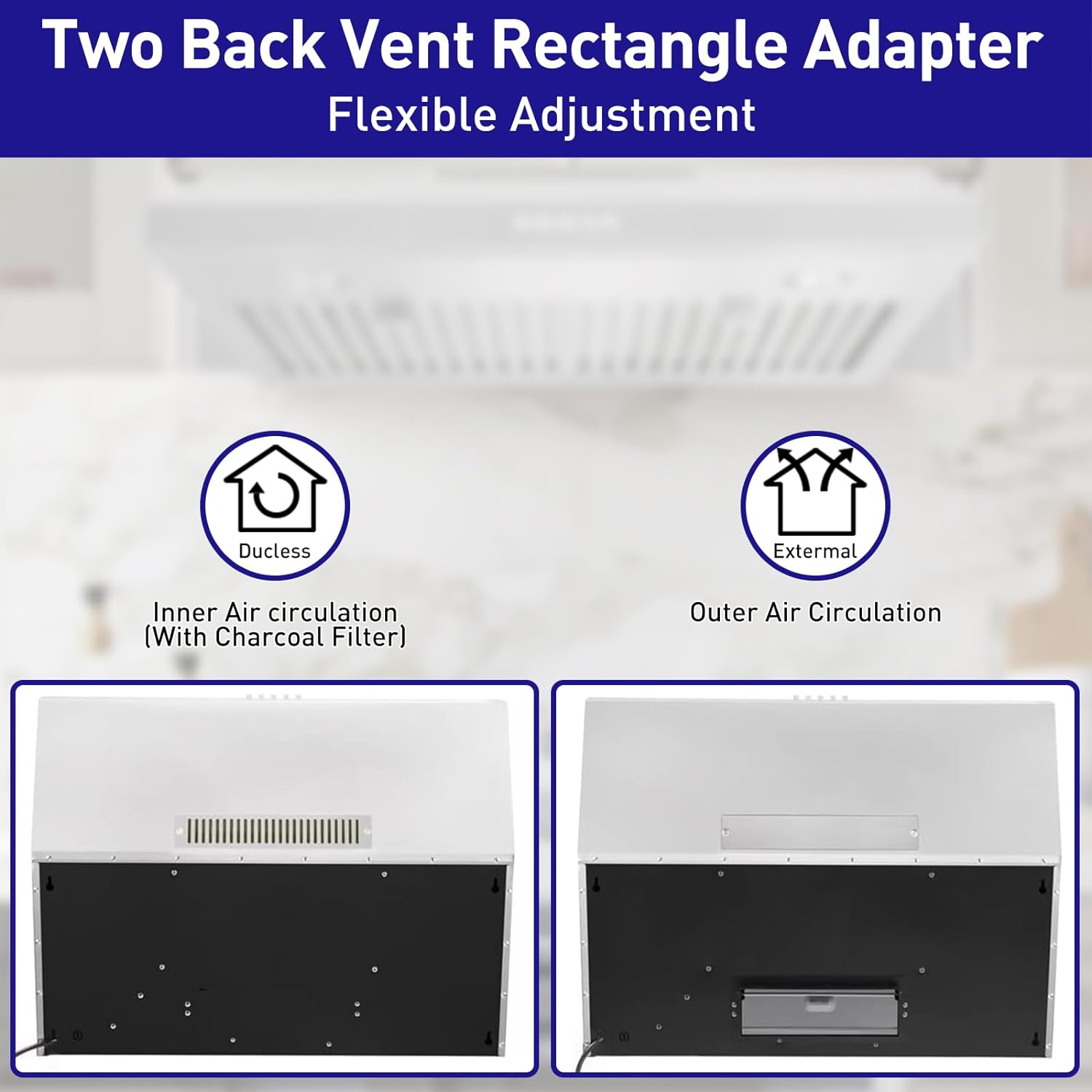 - Ducted & Ductless Venting: Easily convert this kitchen range hood from ducted to ductless with 1 carbon filter (not included; purchase with ASIN: B0BYBNCDJC or B0BZDWP7N8). In addition, this under-cabinet range hood is equipped with flexible external vent connections (top-rectangular and back-rectangular) to adapt to different kitchens.