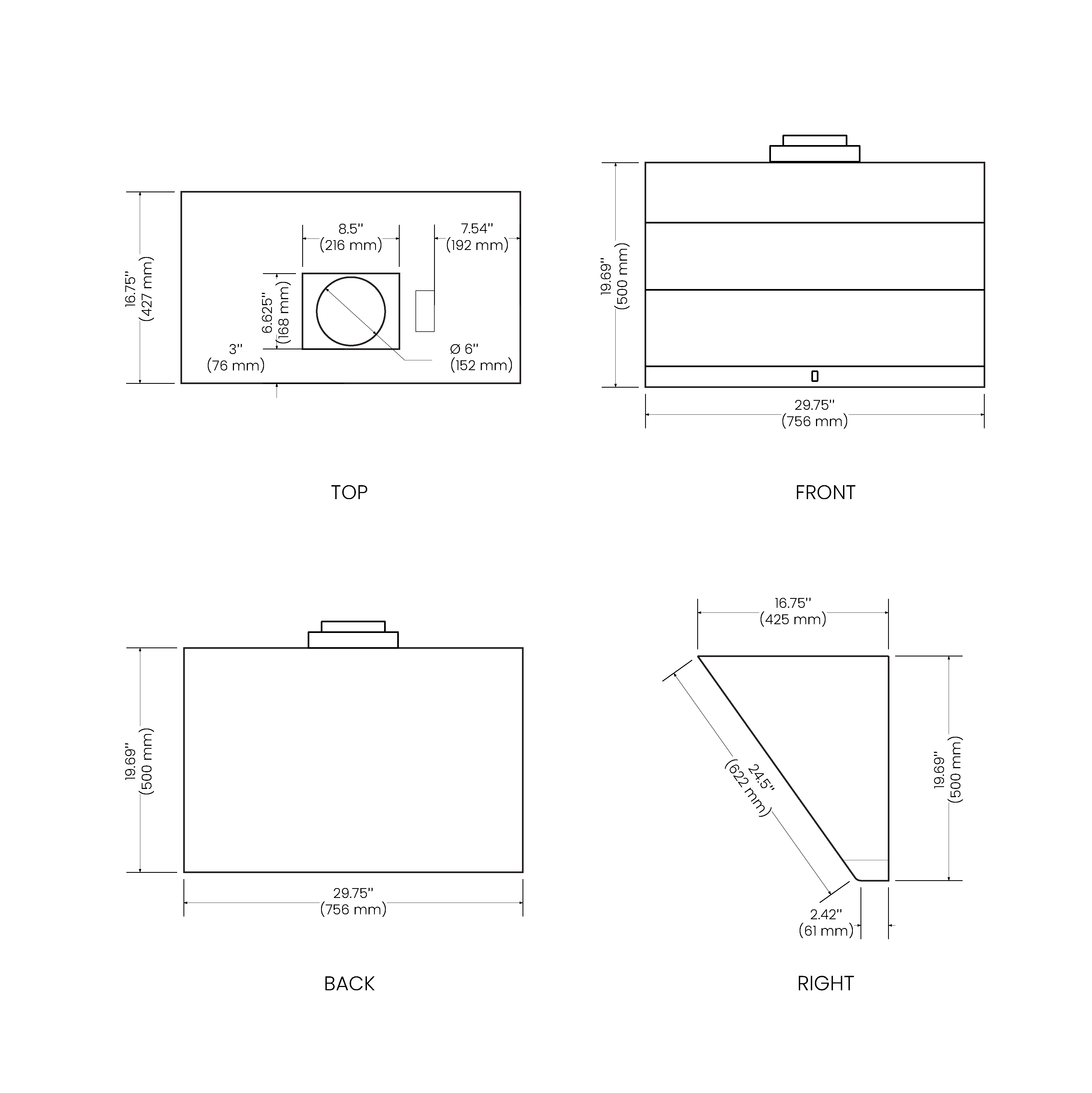 Dimensions de la hotte (L × P × H) | 29,75" × 16,75" × 19,69" |